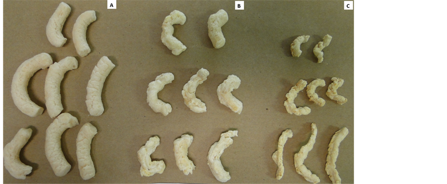 Figure 1. Extruded samples prepared with different concentrations of broken rice and ground lupine. Sample A: 100% broken rice (100BR); Sample B: 90% broken rice and 10% ground lupine (90BR10GL); Sample C: 80% broken rice and 20% ground lupine (80BR20GL).