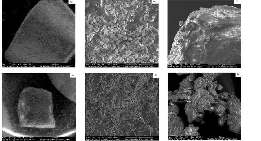 Figure 2. Scanning electron microscopy of broken rice, lupine and their respective flours. A = rice matrix; A1 = broken rice, 200×; A2 = surface broken rice, 5000×; A3 = rice flour, 5000×; B = lupine matrix; B1 = broken lupine, 50×; B2 = broken surface lupine, 2000×; B3 = broken lupine, 3000×.