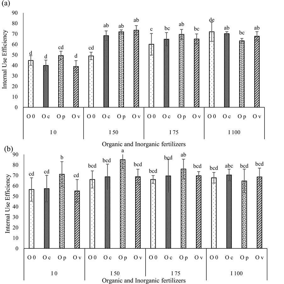 Figure 4. Internal use efficiency of hybrid rice (Palethwe-1) as affected by combined application of organic manures and inorganic fertilizers in (a) dry season and (b) wet season, 2015. The histograms with the same letter are not significantly different by the Tukey HSD test (p < 0.05). The bar on each histogram indicates standard deviation. The numbers followed by I show the percentage of NPK applied based on 150 kg N ha−1, 70 kg P2O5 ha−1 and 120 kg K2O ha−1. I = Inorganic fertilizer; Oc = cow manure, Op = poultry manure and Ov = vermicompost.