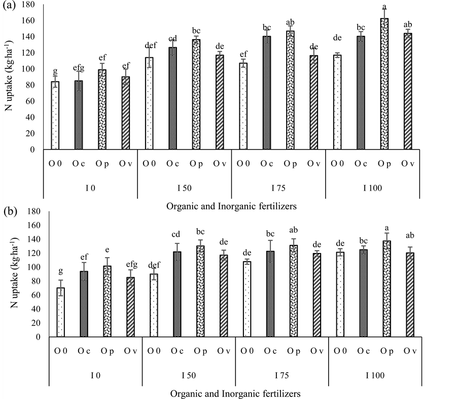 Figure 2. Nitrogen uptake of hybrid rice (Palethwe-1) as affected by combined application of organic manures and inorganic fertilizers in (a) dry season and (b) wet season, 2015. The histograms with the same letter are not significantly different by the Tukey HSD test (p < 0.05). The bar on each histogram indicates standard deviation. The numbers followed by I show the percentage of NPK applied based on 150 kg N ha−1, 70 kg P2O5 ha−1 and 120 kg K2O ha−1. I = Inorganic fertilizer; Oc = cow manure, Op = poultry manure and Ov = vermicompost.