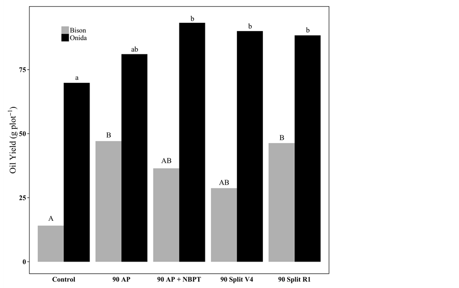 Figure 1. Oil yield (g plot−1) by study site. Treatments consist of Control (0N), 90 kg N ha−1 applied at planting (90 AP), 90 kg N ha−1 with urease inhibitor (90AP + NBPT), 90 kg N ha−1 split-applied with 50% at planting and 50% applied at the V4 growth stage (90 Split V4) and 90 kg N ha−1 split-applied with 50% at planting and 50% applied at the R1 growth stage (90 Split R1). Effects are compared within each site. Mean values followed by the same letter (and case) are not significantly different at P ≤ 0.05.