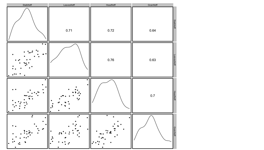 Figure 3. Pearson correlation coefficient matrix demonstrating the linear relationship between the N derived from fertilizer (Ndff) for each component part of the sunflower plant averaged across all site-years.