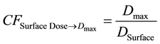 The lack of electronic equilibrium, because of the buildup layer absence, was balanced with the introduction of the conversion factor of surface to maximum dose.