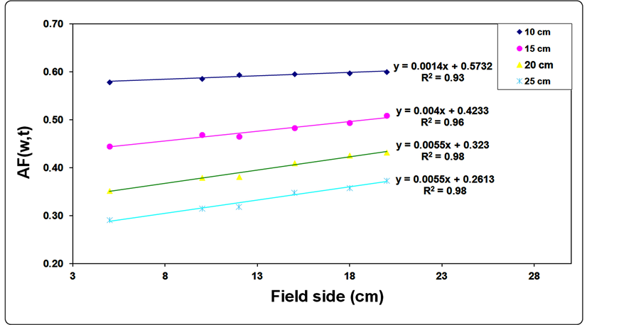 In Figure 3, the attenuator factor AF(w,t) as a function of field side w and phantom thickness t is presented. The attenuator factor for intermediate attenuation thicknesses can be calculated by interpolating the corresponding measured data.