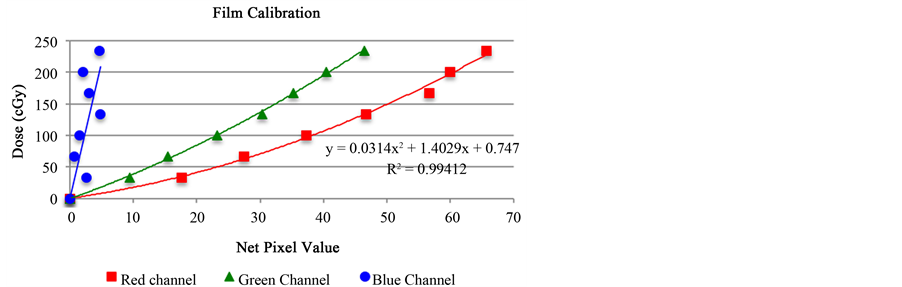 EBT2 film handling was performed according to the recommendations by Alva H et al. [15] . EBT2 films were cut in 5 × 5 cm2 pieces for dose calibration and patient in vivo measurements. All films, prior to irradiation were scanned (RGB format, 150 dpi) with an EPSON perfection V750pro, for pre-irradiation background measure- ment [16] . EBT2 dose calibration was performed by placing individual precut films in a homogeneous solid wa- ter phantom at 10cm depth on the central axis of the beam. All films were irradiated with a 10 × 10 cm2 field and 50 - 350 MUs while the corresponding reference dose Dref was measured with a Farmer FC65G ionization chamber positioned at the same irradiation conditions with that of EBT2 films. Post-irradiation film scanning was performed 24 hours after irradiation [17] while the TIFF images obtained were further analyzed with the program MATLAB 7.1 on the three color channels (RGB).