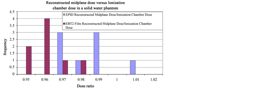 The distribution of the ratios of the EPID reconstructed doses to the ionization chamber measured doses re- veals a mean value of 0.983 and a standard deviation of 0.013 (Figure 6). While, the distribution of the ratios of