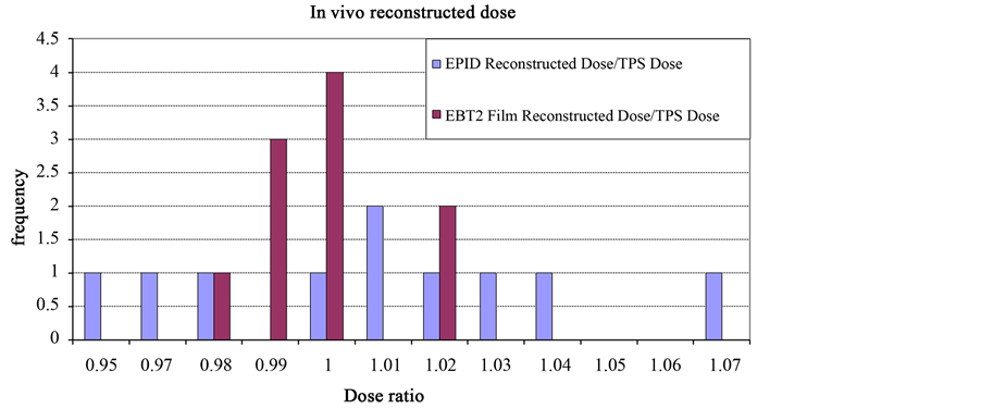 The ratio distribution of the EPID in vivo reconstructed doses to the TPS isocenter doses reveals a mean value of 1.008 and a standard deviation of 0.032 (Figure 7). While, the ratio distribution of the EBT2 film in vivo reconstructed doses to the TPS isocenter doses reveals a mean value of 0.998 and a standard deviation of 0.013 (Figure 7). These values are within the ±5% which is the classical in vivo tolerance level [2] , indicating the method’s accuracy. It is also revealed that the discrepancy between EPID dosimetry and EBT2 film dosimetry is 1%.