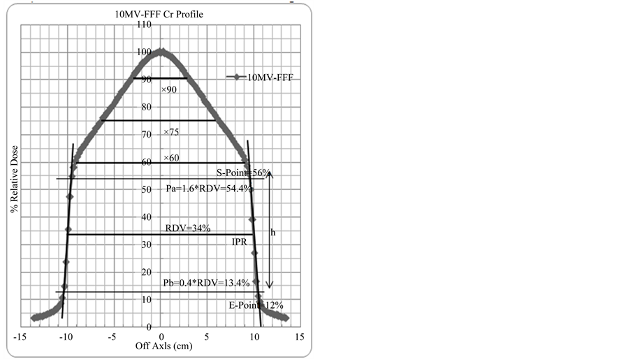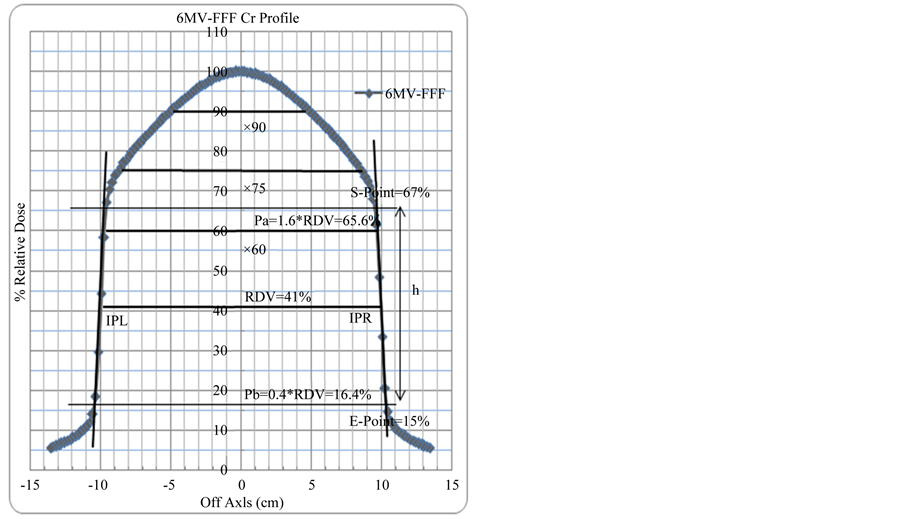 Group, for determining radiation beam penumbra, dose value of IP is taken as reference dose value (RDV). Points Pa and Pb are located at 1.6 and 0.4 times of RDV, respectively [3] . Determined points shown on the pro- file, as shown in Figures 2(a)-(d). Lateral separation between Pa and Pb on either side of the profile is consi- dered as a measure of the radiation beam penumbra. The penumbras along major axes are indicated for all the available FFF photon beam energies.