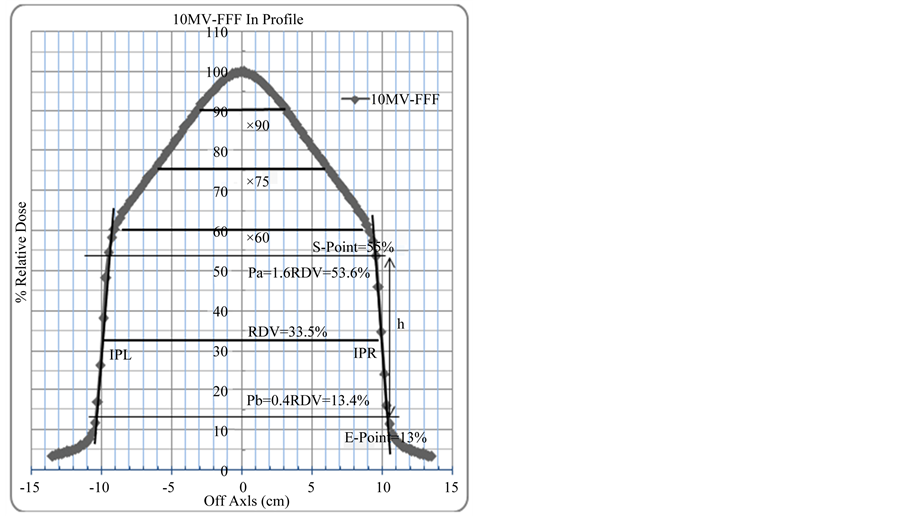 Usually, the field size of flat beam defined as the distance between 50% of the isodose level in profile, norma- lized to 100 at beam central axis at reference depth [4] . Same definition cannot be applied to FFF beam. In order to determine the field size for FFF beam, the AERB Task Group recommended the procedure as follows [3] . Field size shall be defined by collimator settings only. For verifying the constancy of the beam profiles along major axes (In-Plane and Cross-Plane), the separation between inflection points (IPs) been recorded. Inflection point was identified as per its mathematical definition. However, for practical purposes, it is approximated as the mid-point on either side of the high gradient region (sharply descending part) of the beam profile. Its location was identified as follows Figures 2(a)-(d) locate starting point (S) and end point (E) on high gradient region of the beam profile. The vertical separation between S and E gives rise to the height (h) on the high gradient region of the beam profile. The Inflection point is located in h/2 on both sides of the beam profile. Separation between inflection points is defined as the geometrical field size for the FFF beam [3] . Field size for both FF and FFF beam is illustrated.