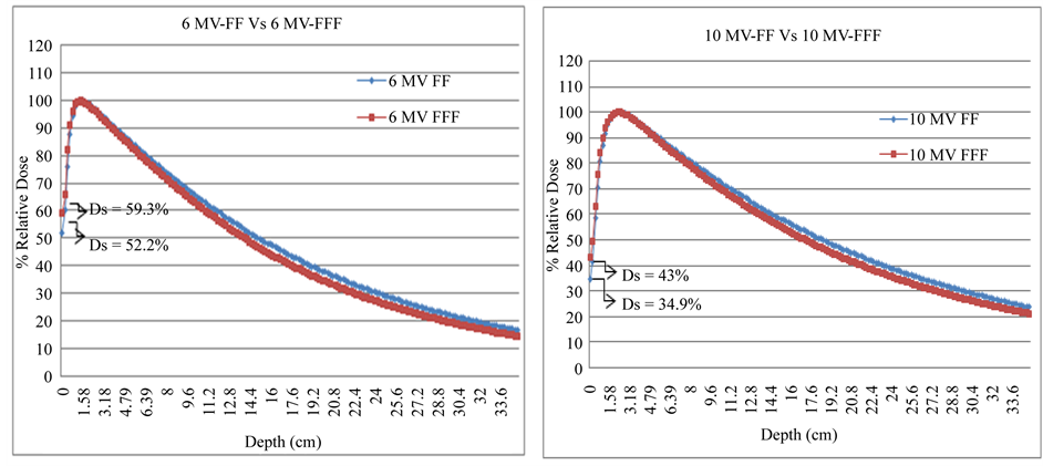 Softening of beam spectra and loss of beam hardening effect yield reduction in PDD at 10 cm for 6 MVFFF and 10 MVFFF FFF beam from their corresponding 6 MV and 10 MV FF beam were 4.35% and 5.30% observed respectively. No any significant changes are observed in the value of Dmax over the range of field size for 6 MV, 10MV FF and 6 MVFFF, 10 MVFFF FFF beam. Evaluated data were fully compliance with the various pub- lished literature [10] [11] . Measured compared depth dose curve for both FF and FFF beam energies shown in Figure 3(a) and Figure 3(b). Removal of flattening also causes a significant rise in surface dose for FFF beam