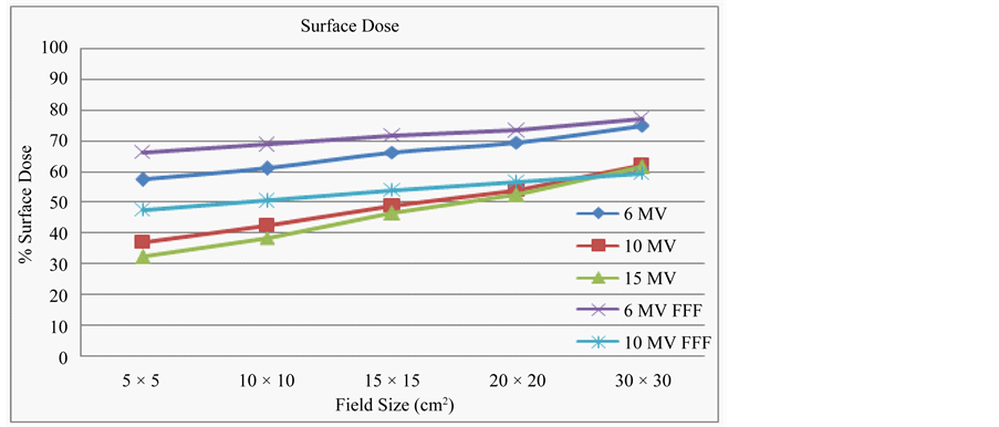 compared to that FF beam. Increase in a surface dose of 7.1% (with CC013), 9% (with PPC05) for 6 MVFFF and 8.1% (with CC013), 10.6% (with PPC05) for 10 MVFFF beam were observed compared to that of flattened beam. Measured depth dose parameter and surface dose for selective field sizes are shown in Table 1 and Table 2 respectively. Variation of surface dose with beam energies of FF and FFF beam are shown in Figure 4.