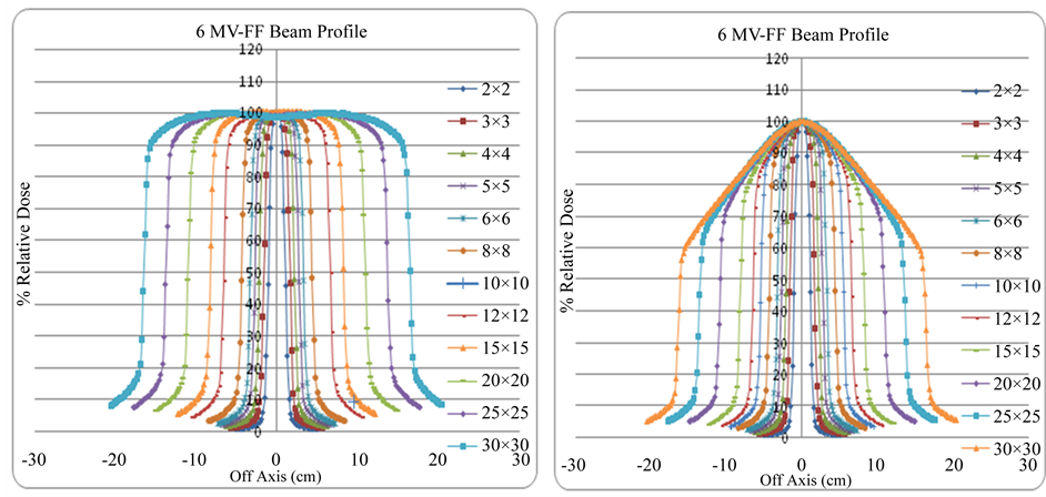 Flatness and Symmetry values for FF beam and FFF beam are shown in Table 2. These differences between FF and FFF beams can again be explained by the off-axis softening effect in FFF beams. Reduction in off axis ratio of 5% and 9% for 6 MVFFF and 10 MVFFF was observed in comparison of flat beam in both cross-line and in-line beam profile at ±3 cm respectively. Figure 5(a), Figure 5(b) and Figure 6(a), Figure 6(b) shows FF and FFF beam profile for 6 MV and 10 MV respectively.