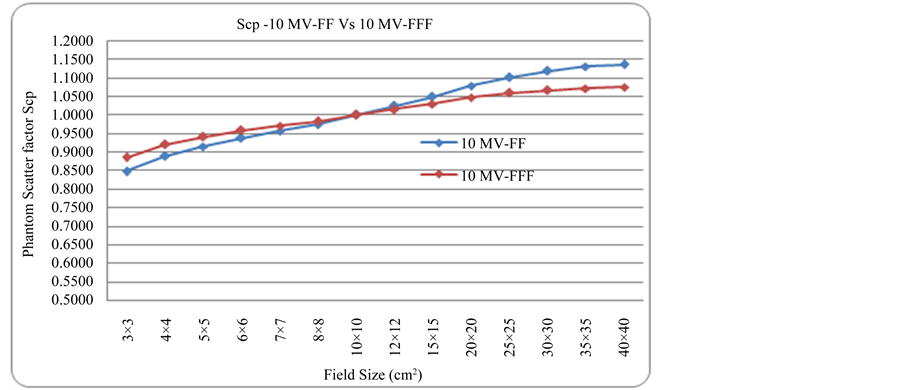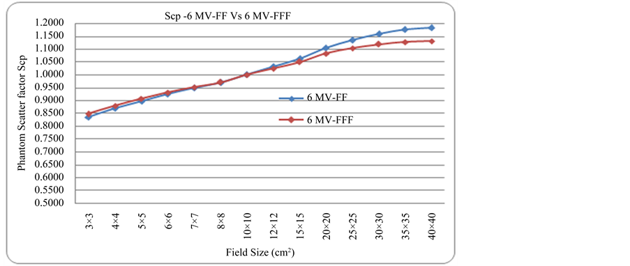Total output factor is the product of collimator scatter (Sc) and phantom scatter (Sp) factor. It has been observed that output factor (Scp) at a smaller field sizes for FFF beam slightly higher in magnitude compare to that of FF beam. Delta variation between FF and FFF slowly decreases with rise in field size and output factors converges to unity at field size of 10 × 10 cm2.There is no significant difference in Scp at smaller field sizes for 6 MVFFF beam compared to 6 MV. However, as the field size were increased above 10 × 10 cm2, increase in Scp values for (6 MV, 10 MV) FF beam compared to (6 MVFFF, 10 MVFFF) FFF beams were observed. Delta variation between FF and FFF comparatively, found to be more for higher energy beam and also at the higher field size. Consequently, at smaller field size in-air collimator scatter factors of FFF beam were found to be the lesser than that of a corresponding FF beam [13] . Dominant factor at lower field sizes are collimator scatter (Sc), whereas at higher field sizes are phantom scatter (Sp). The Difference in two different curves is due to the reduction in head scatter contribution, whereas phantom scatter is remains same. Significant differences in output factor (Scp), between FF beam and FFF beam shows an important role of flattening filter.