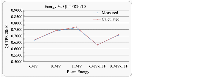 Comparisons of Measured and calculated values of TPR20/10 for available beam energy are shown in Table 2. Beam quality of FFF beam found to be lesser in magnitude compared to that of FF beam. Percentage of magnitude difference in 6 MVFFF and 10 MVFFF were found to be 5.42% and 4.50% than that of 6 MV and 10 MV FF beam respectively. The percentage deviation between measured and calculated value were observed 0.6%, 0.26%, 0.08%, 0.35% and 0.82% for 6 MV, 6 MVFFF, 10 MV, 6 MVFFF and 15 MV respectively. Graphical representations of beam quality verses beam energy are shown in Figure 8.