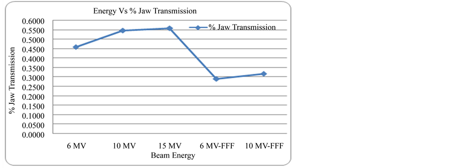 Reduction in percentage of average jaw transmission found to be 1.58 and 1.71 times for 6 MVFFF and 10 MVFFF FFF beam than that of corresponding 6 MV and 10 MV FF beam respectively. Values of measured average jaw transmission are shown in Table 2 and Figure 9 provides a graphical variation of average jaw transmission verses beam energy.