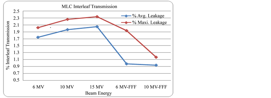 Measured values of average and maximum interleaf MLC transmission is shown in Table 2. MLC transmission is increasing with the increase in beam energy. Significant reduction in MLCs interleaf transmissions was observed for FFF beam compared to that of FF beam. This reduction in average interleaf transmissions was found to be 1.78 and 2.09 times for 6 MVFFF and 10 MVFFF FFF beam than their corresponding 6 MV and 10 MV FF beam respectively. Similarly, the magnitude of decrease in maximum interleaf transmission for 6 MVFFF and the 10 MVFFF FFF beam is 1.04 and 1.93 times than that of 6 MV and 10 MV FF beam respectively. All the interleaf transmission measurements were performed at 10 cm off-axis. Minimal difference has been observed at central axis and at 10 cm off axis. Because of the divergent nature of the beam, Interleaf transmission for peripheral MLC found to be lesser compared to that of central one. Graphical representation of Average and Maximum interleaf transmission with beam energy are shown in Figure 10.