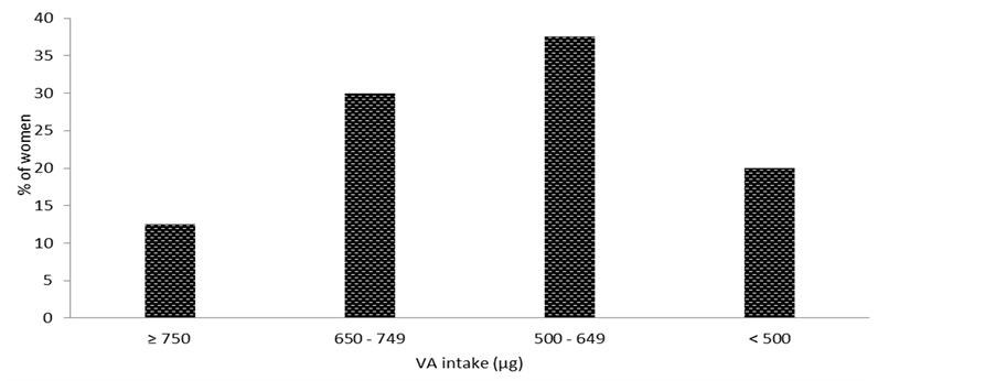 It is possible that the low VA and nutrient intake in this study could be related to the fact that, this study was carried out during the dry season when food crops and vegetables were scarce and expensive on the market, and as such quantities consumed in the household are reduced. Secondly, the majority of women in this study were in the first trimester of pregnancy, corresponding to a period when the amounts of cooked foods consumed may be reduced due to bouts of nausea resulting from hormonal changes in their body [32] . It is therefore necessary that this study be repeated during the rainy season when food crops and vegetables are in abundant supply and affordable, to establish seasonal variations.
