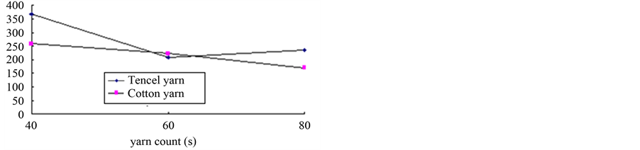 Compared with yarn of the same count, breaking strength of tencel yarn is higher than cotton yarn except it’s around 60 s; Breaking strength CV of tencel yarn is higher than cotton yarn except it’s around 80 s.