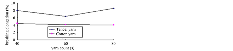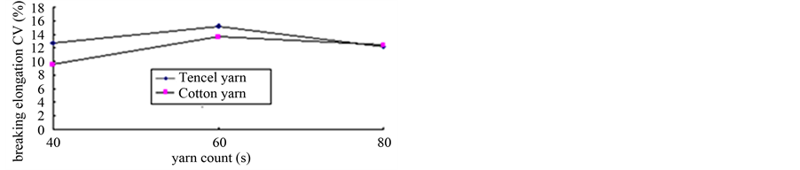 2) Compared with yarn of the same count, breaking elongation of tencel yarn is higher; CV of breaking elon- gation of tencel yarn is slightly higher than that of cotton yarn, and it goes nearer of CV of breaking elongation between tencel yarn and cotton yarn.