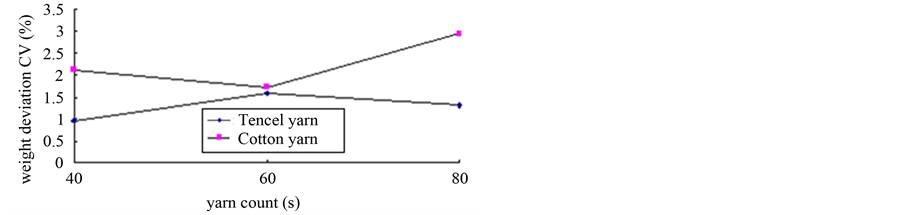 a) There is no significant relation of weight deviation between yarn and tencel yarn; compared with cotton yarn of the same count, the weight CV of tencel is lower than that of cotton quality (the lower the CV value is, the more stable the yarn quality is).
