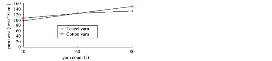 b) At the circumstance that yarn twist values of tencel yarn and cotton yarn are similar, compared with yarn of the same count, the twist CV of tencel yarn is higher than that of cotton yarn.