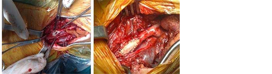During the follow up a color flow ultrasonography Doppler imaging of the left carotid artery revealed a pseudoaneurysm with a diameter of 8 mm on the lateral side of the patch and a magnetic resonance angiography verified the findings (Figure 3). The child was once again taken to the operative room. Through the same neck incision the LCCA was exposed and two vascular clamps were placed close to the borders of the patch. A segmental resection of the LCCA including the patch was performed with an interposition of a saphenous vein graft with end to end anastomosis (Figure 4). The wound was closed in layers, and a drainage tube was left in place. The duration of cross-clamping of the LCCA was 25 minutes.