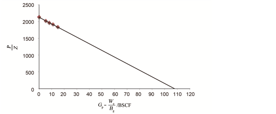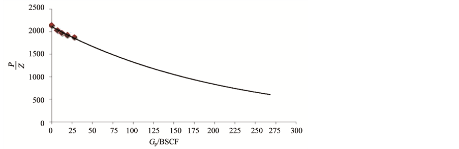 For a volumetric reservoir, the relationship between (P/Z) and Gp is essentially linear because of volumetric depletion of gas reservoir and by extrapolation of the straight line to abscissa, i.e., at P/Z = 0, gives the value of the gas initially in place as G = Gp [3] . But the graphical representation of pressure and production history of RS Reservoir shows the presence of water influx, as shown Figure 1 where the plot of (P/Z) versus Gp deviates from the linear relationship, it indicates the presence of water encroachment [4] [5] .