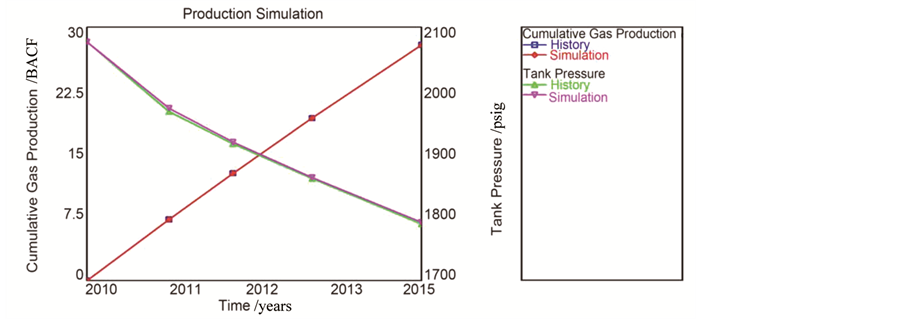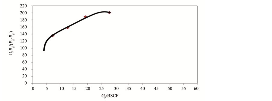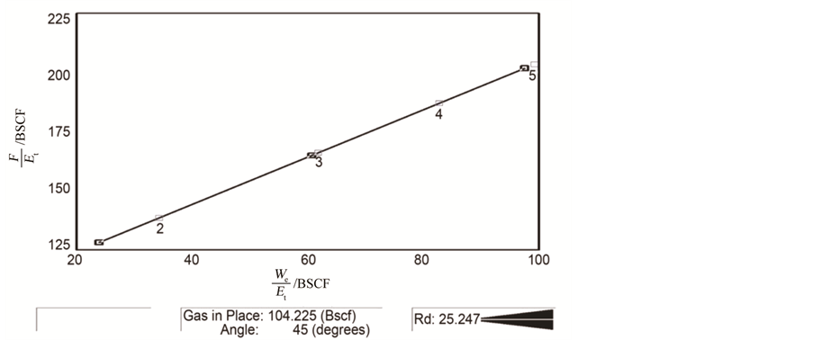 Havlena-Odeh graphical method was adopted to perform material balance calculations which matched with Hurst-Everdingen Dake Radial Aquifer model [13] [14] [15] . An iterative non linear regression was used to automatically find the best mathematical fit for a given model showed original gas in place of 104 BSCF (Figure 6).