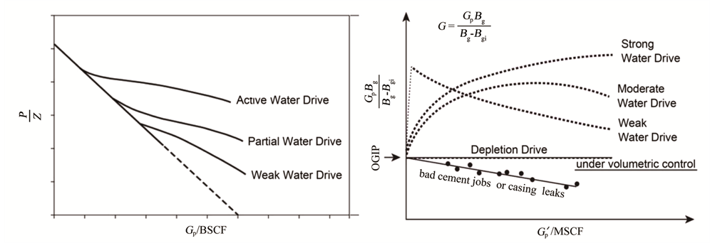 Knowledge of reservoir drive mechanism is necessary in order to prepare dynamic model to calculate initial gas in-place [2] . Normally, gas reservoirs are produced by expansion of the gas contained in the reservoir. The high compressibility of the gas relative to the water in the reservoir (either connate water or underlying aquifer) makes the gas expansion the dominant drive mechanism. But this depletion drive mechanism changes to water drive mechanism by different indices in different reservoirs depending upon the properties and geometries of the reservoir and aquifer.