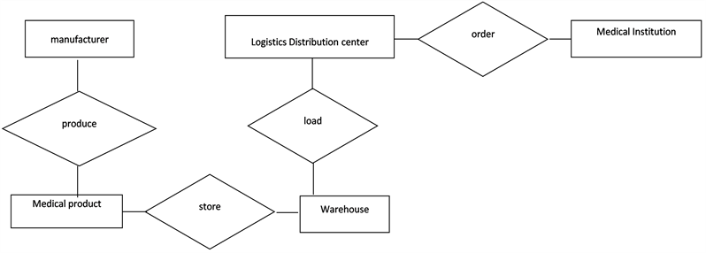 Medical products supply chain includes manufacturers, medical products, warehouses, logistics distribution center, medical institutions and other entities. While designing the database, first, a table is created for each entity, and a primary key is determined for each table. Then according to the needs of management, relationships between tables are created. The E-R diagram for the database is shown in Figure 2.