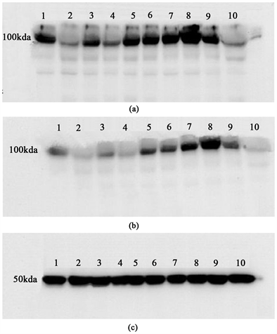 Western blot analysis with an anti-β-tubulin antibody (Figure 1(c)) showed that the same amount of protein was used in the samples evaluated.