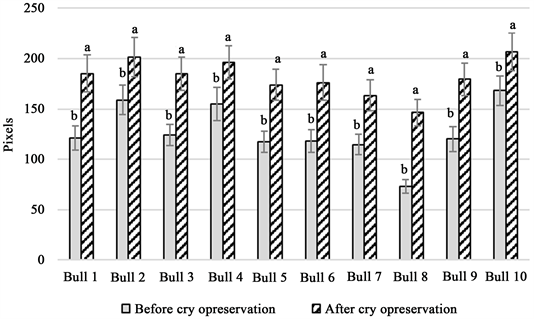 Figure 2. Number of pixels in the ACE bands, as detected by western blot, for 10 Nelore bulls, pre- and post-cryopreservation, calculated by Image J Software 1.40. The lower the number of pixels, the greater the amount of ACE. Different letters represent a significant difference, determined by the t test (P < 0.05).