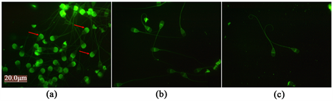 Figure 4. Smears stained with FITC PSA were analyzed under an epifluorescence microscope to estimate the percentage of spermatozoa with a positive acrosome reaction. (a) heparin; (b) Control; and (c) Captopril + heparin. 400× magnification. Green coloration in the acrosomal region indicates a positive acrosome reaction (red arrow).