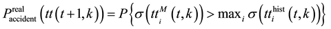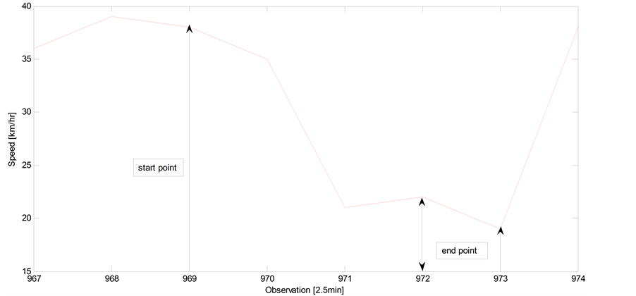 This section presents a methodology to detect road accidents based on travel time variations. We consider accident during peak periods (i.e., morning or afternoon) and during non-peak periods. The observed traffic data consists of normal and abnormal (accident) travel data. The abnormal record is at least 30 km/h lower traffic speed than the average speed of all records at the same time on the same day of the week. The threshold of 30km/h is a symbolic value of the smallest speed change that people would consider “abnormal”. Threshold determination depends on the travel observation data. Equation (1) will be used to forecast the accident scheme.