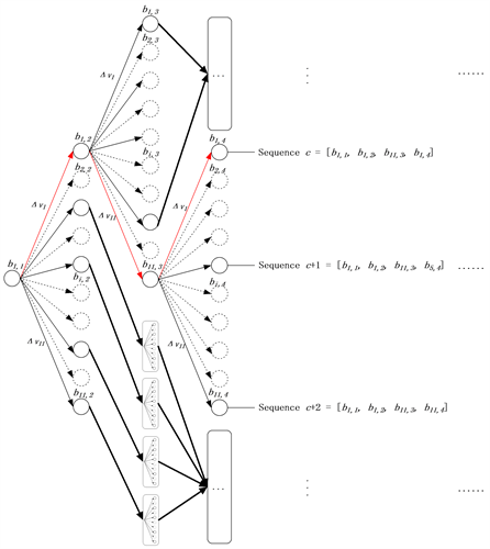 Figure 4. The procedure of the IEMM algorithm. The solid arrows and circles refer to the recorded sequences, and the dotted arrows and circles refer to the abandoned sequences. The red arrows are connected to show an example sequence c.