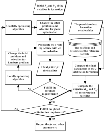 There are two layers of the loop. The inner layer is the solving of the J2 perturbed Lambert problem. The locally optimization shooting method is used to solve the boundary value problem. If the three satellites’ final positions Rf and velocities Vf equal the values predetermined by the theoretical relationship of the formation, the problem is solved. The predetermined values are given by the sequence searching and formation designing algorithms. When the position and velocity of the reference satellite are provided, based on the relationship between the three satellites in formation, the required positions and velocities of the follower satellites are determined, which are the objective values of the shooting method.