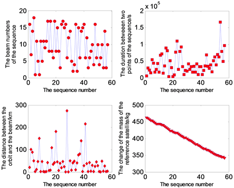 Figure 8. The sequence searching result. The first sub-figure refers to the beam numbers of the best sequence. The second sub-figure refers to the duration between two points of the sequence. The third sub-figure refers to the distance between the reference satellite’s orbit and the central line of the corresponding target beam. And the fourth sub-figure refers to the change of the reference satellite’s mass.