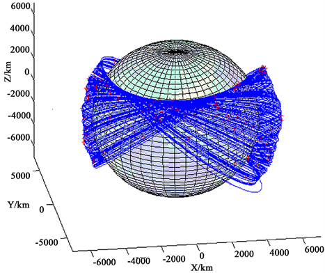 For the formation transfer and maintenance, the MICM described in section 3.4 is employed. The time points, Δvs of all maneuvers are optimized by the DE algorithm and J2 perturbed Lambert problem solving algorithm. Therefore, the satellites can fly following the reference satellite and the formation can be maintained. The orbit of the reference satellite is shown in Figure 9, in which the red pluses refer to the maneuvers.