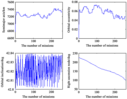 The changes of the reference satellite’s elements are shown in Figure 10, in which the semi-major and the orbital eccentricity are firstly raised by the initial transfer, and then oscillate in the following transfers. The orbital inclination nearly unchanged to save fuel. And the right ascension node changes from about 225 deg to 100 deg due to the J2 perturbation.
