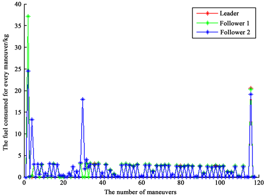 Figure 11. The consumed fuels for the satellites’ maneuvers.