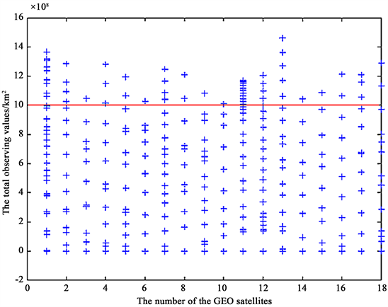 Figure 12. The monitoring profits of all the GEO satellite’s beams (The red line refers to the value of 1 × 107 km2). The distance between every two pluses for every beam refers to the incremented monitoring profit for every monitoring mission.