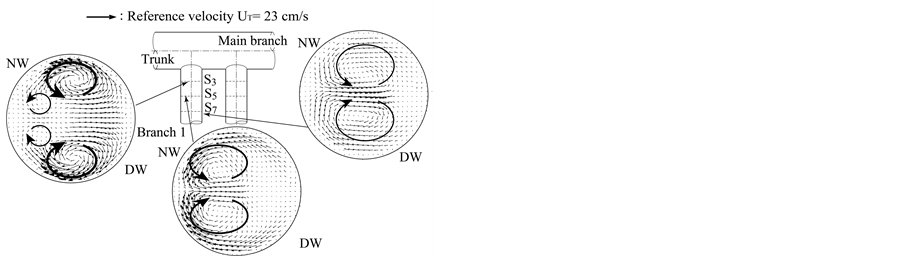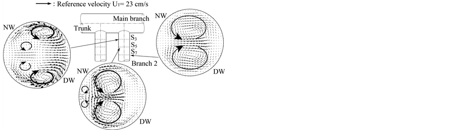 Secondary vortices are seen in Figure 3(a) and Figure 3(b). Two pairs of vortices have formed in a symmetrical arrangement at section S3 in Branches 1 and 2.
