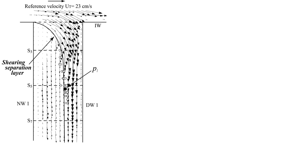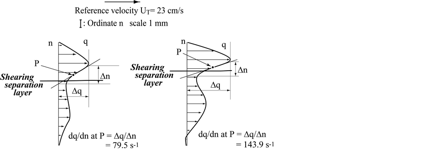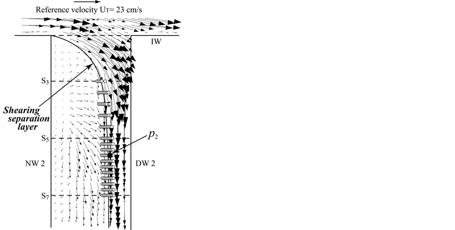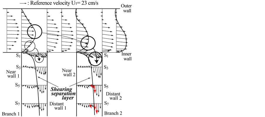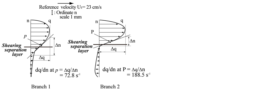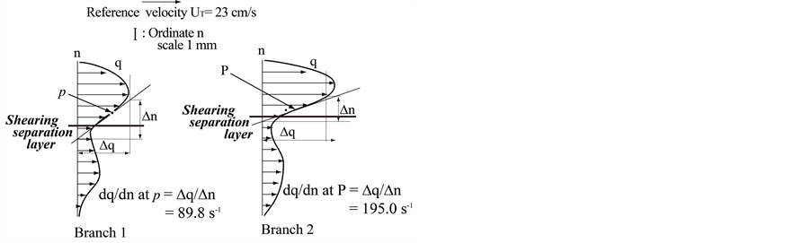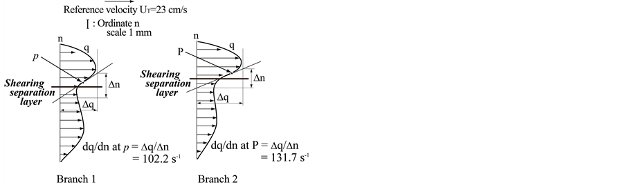 The tangential velocity profile along the shearing separation layer in Figures 10(a)-(c) for cross-sections S3, S5 and S7 in Branch 2 has distinctly the point of inflection P, and the shear rates are 188.5 s−1, 195.0 s−1 and