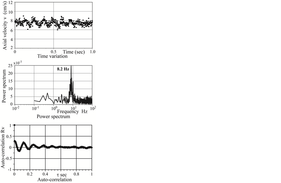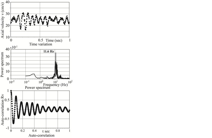 The position of vibration marked by dot in Figure 4(a) and Figure 4(b) spreads along the shearing separation layer. The periodic vibration extensively appears in Branch 2. From spectral analysis of the axial velocity at typical points p1 and p2 in both side branches in Figure 5(a) and Figure 5(b), respectively, the frequency of f = 11.6 Hz at p2 in Branch 2 is 40% higher than that of f = 8.2 Hz at p1in Branch 1. This difference is strongly associated with the movement of core fluid upstream in the trunk flowing into Branch 2. Furthermore, the auto-correlation in Branch 2 is much clearer than that in Branch 1.