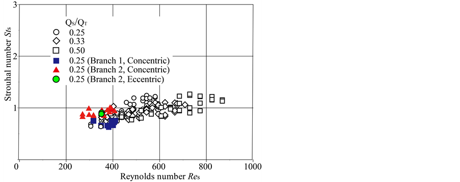 For both double T-junctions, the relationship between Reynolds and Strouhal numbers is plotted in Figure 8 for both branches and compared with result for a single T-junction [18] . The Reynolds and Strouhal numbers are defined as ReS = 2RSUS/ν and StS = 2fRS/US, respectively, where US is the mean velocity in the side branch. Finally, the Strouhal numbers of 0.66 and 0.93 at the Reynolds number of 370 in Branches 1 and 2 are approximately 10% and 55%, respectively, both larger than that of 0.60 at corresponding Reynolds in a single T-junc- tion in the previous study [18] .