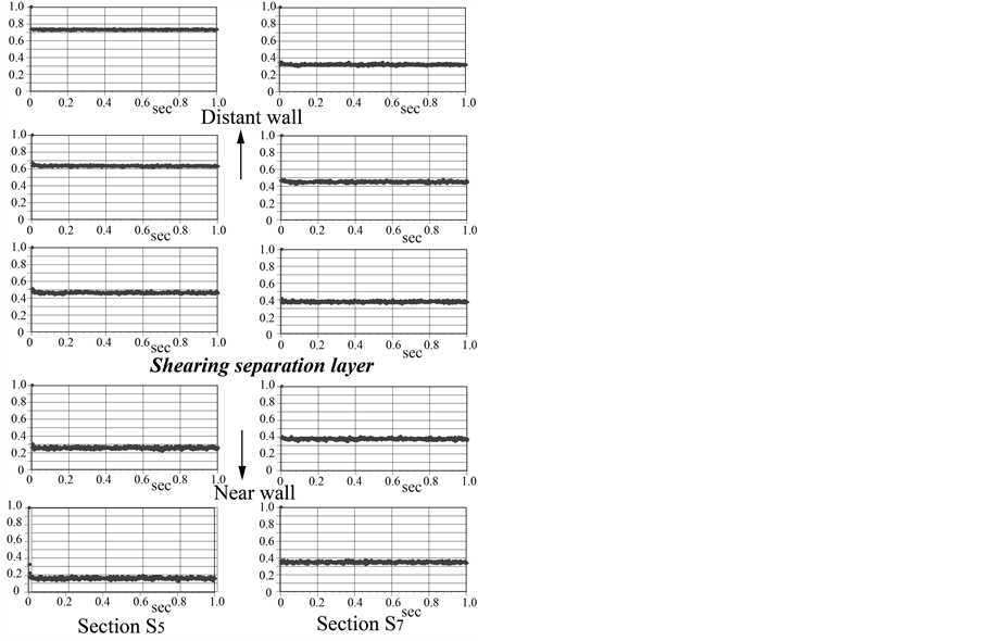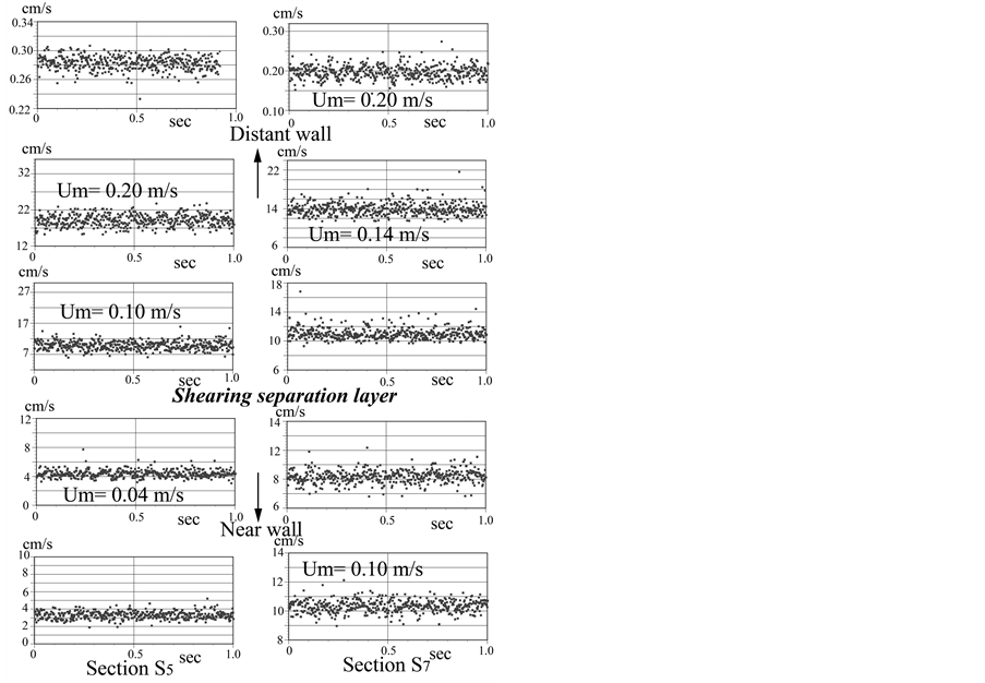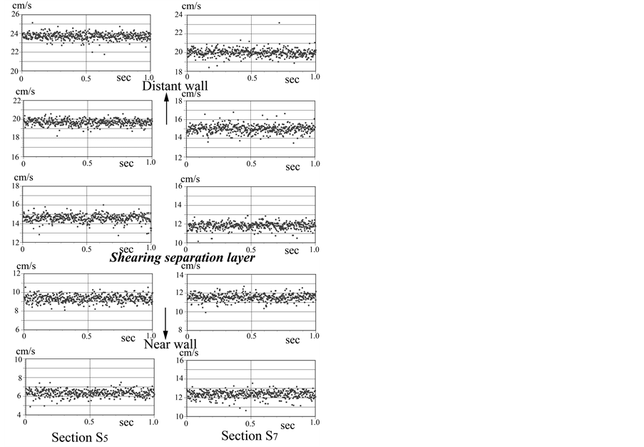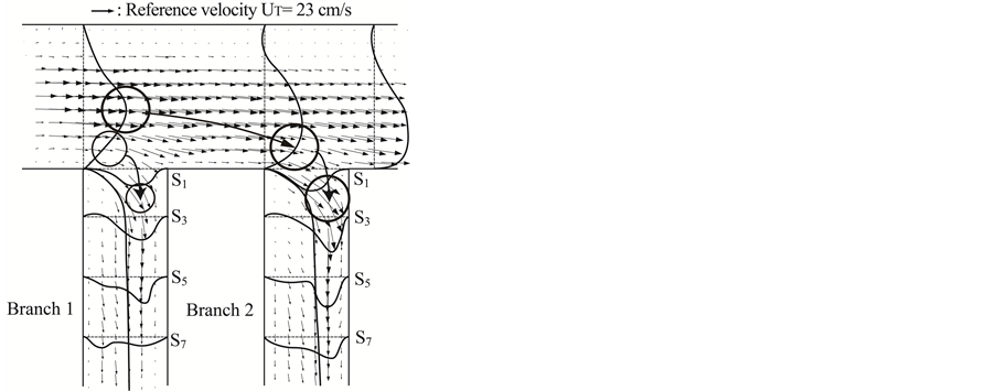Cross-sections in the side branch where flow visualizations of velocity vector fields were performed are marked as sections S3, S5 and S7. The line of shearing separation layer in the side branch is decided by operators based on PIV results. Details of the measurement procedure for LDA are described in the previous study [18] . In PIV measurement, the interrogation window size is 16 pixels × 16 pixels, with 50% overlapping. In LDA measurement, the velocity is measured in data sampling rate of 1 μs, during total 40-second every 2 ms, i.e. a 20-k data set.