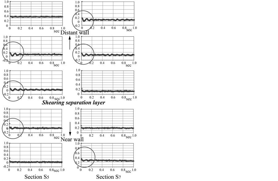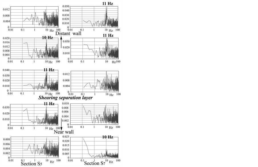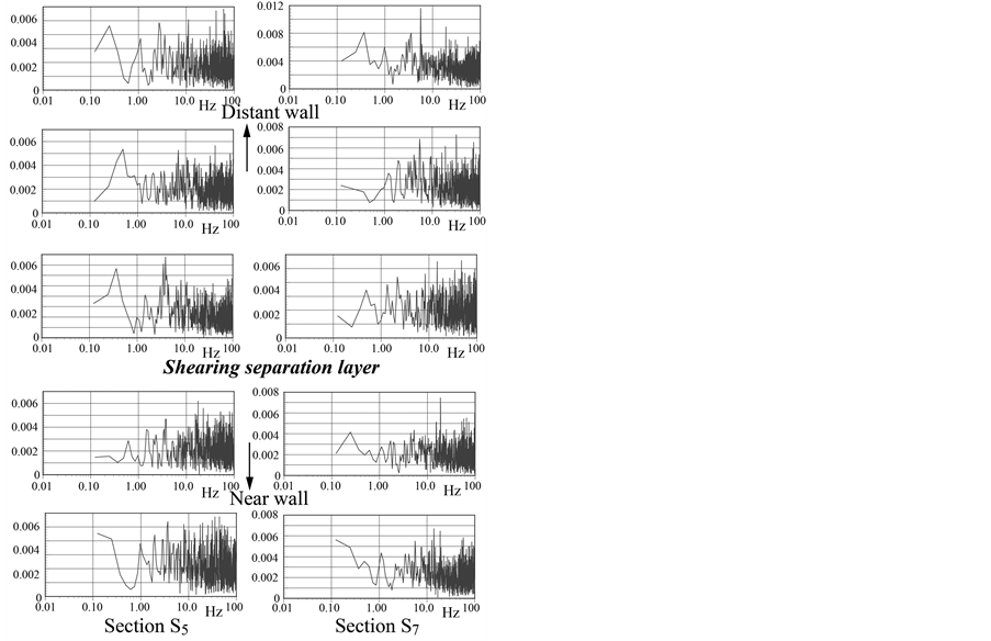 The temporal variation of the axial velocity component in both side branches was obtained in Figure 11(a) and Figure 11(b). The data corresponds to a one-second interval from a total 40 second of data measured at median plane at sections S5 and S7. Um in Branch 2 in Figure 11(b) denotes the mean velocity at the point where the fluid vibration appears. The power spectra corresponding to these temporal variations are plotted in Figure 12. The frequency is not as distinct compared with that for axi-aligned branches. However, the frequencies from 10 to 11 Hz in Figure 12(b) are prominent at several points near the shearing separation layer. Therefore, it is suggestive of a high-shear-rate flow with points of inflection vibrating with the periodic frequency.