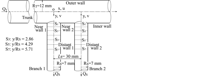 The velocity components and the flow visualization of cross-sections for the velocity field are also given in Figure 1(a). In the side branch, v and u represent the axial and transverse velocity components, respectively.
