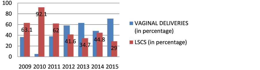 Deliveries. According to recent guideline, Elective LSCS is not recommended. It is evident from the data in Table 4 and Figure 4 that mother to child transmission was nearly 4 cases in LSCS and nearly 3 cases in VAGINAL deliveries in past 7 years. In Table 3 and Figure 5 in 2015, mostly vaginal deliveries were preferred i.e. 71% w.r.t 36.8% in 2009.