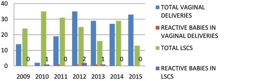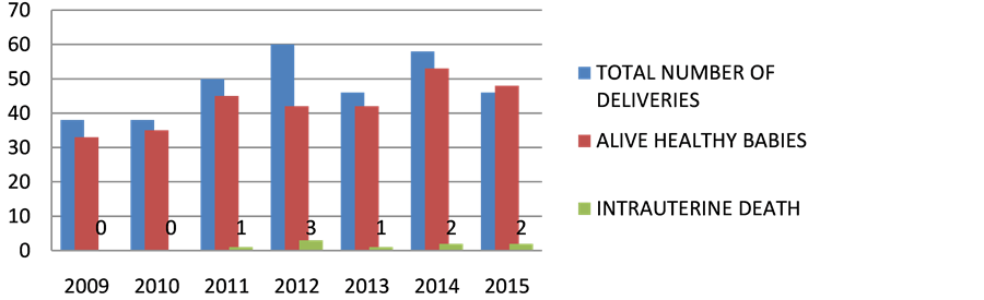 There were 338 deliveries from 2009 to 2015, 298 babies were found to be alive healthy and 11 were certified.29 went to nursery and 9 were with Intrauterine fetal demise.